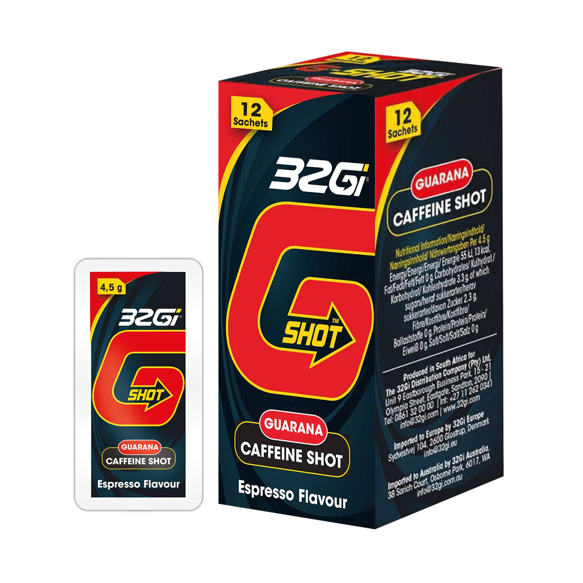 The 32Gi® G-Shot is designed with the you, the athlete, in mind. Separate your caffeine from your carbs, and you control how much, and when, to take. A 60 mg shot of pure liquid guarana caffeine delivered via a 4.5 g gel to replicates the potency, taste and effect of a real-life espresso coffee shot.